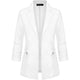 3/4 ruched sleeve blazer, Open front without button, Mid length, Solid colour, Notched lapel, Flap pockets with gold button closure, casual and formal.
