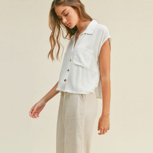 A short sleeve button down crop camp shirt in a linen blend woven fabrication featuring a side slit at bottom opening;