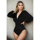 Plunge Neck Peasant Sleeve Bodysuit in Black