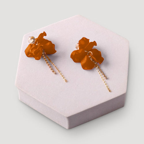 Drop-style earrings featuring layered petal embellishments with cascading chain tassels for romantic movement.