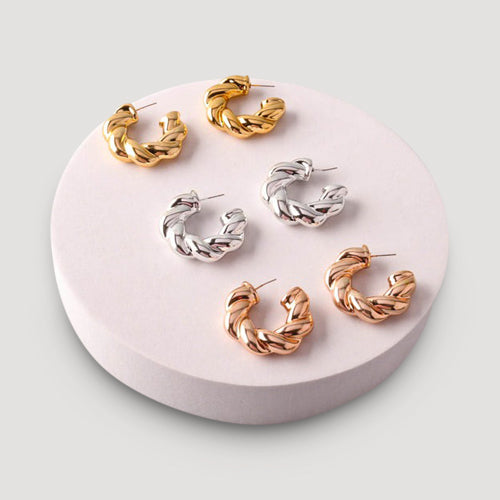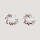 Huggie-style hoop earrings featuring polished circular frames with twisted metallic detailing for sleek, sculptural styling.