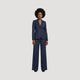 Two-piece pant suit featuring tailored blazer with three-pocket design and wide-leg trousers for elevated styling