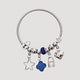 Quatrefoil Stretch Charm Bracelet in Silver Blue. This bracelet features a silver-tone band with various charms, including a notable blue quatrefoil charm, symbolizing luck and fortune, accented with striking blue details and a polished silver-toned finish. A perfect blend of style and sentiment, designed for effortless wear.