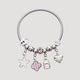 Quatrefoil Stretch Charm Bracelet in Silver Pink. This bracelet features a silver-tone band with various charms, including a notable pink quatrefoil charm, symbolizing luck and fortune, accented with striking pink details and a polished silver-toned finish. A perfect blend of style and sentiment, designed for effortless wear.