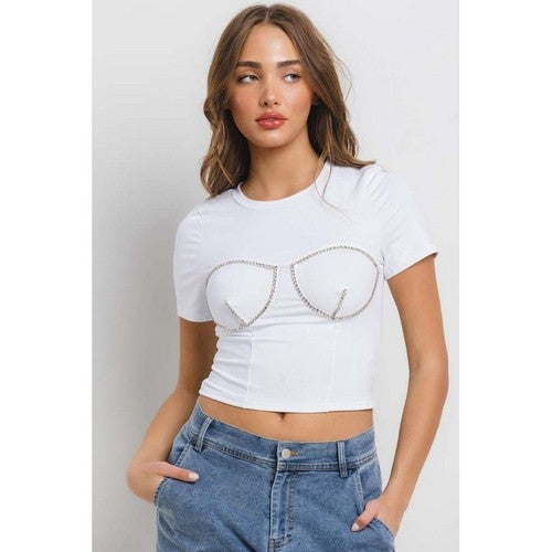 Features rhinestone embellishments outlining a stylized bustier shape for eye-catching sparkle
