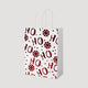 Small gift bag silhouette featuring repeated “HO” text and scattered red snowflakes on a crisp white background